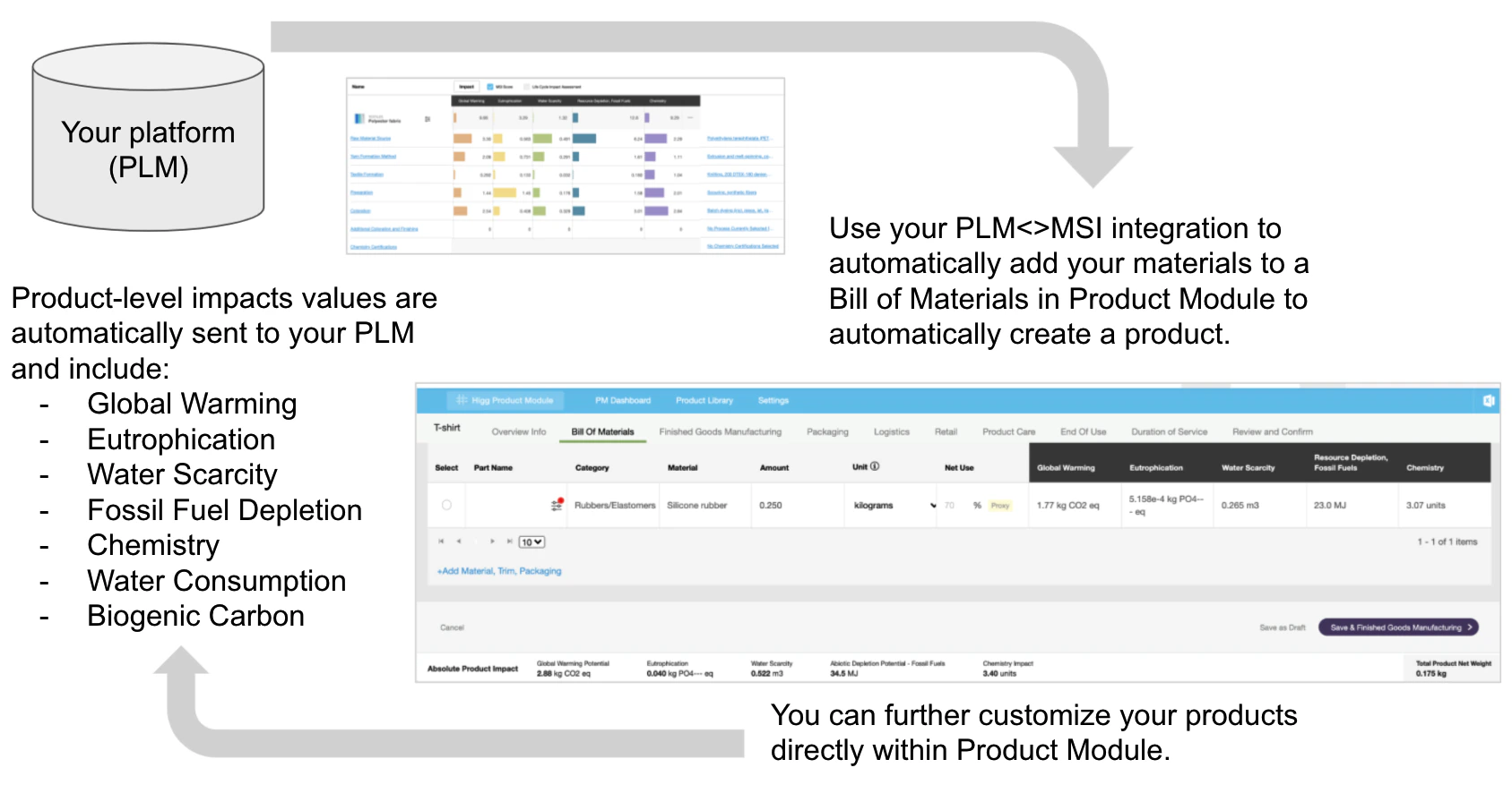 The Higg Product Module includes a full analysis of the product inputs and processes to calculate a cradle-to-grave (ie raw material through end of use) product impact assessment. The PM API allows you to automatically send your MSI materials to Product Module to fill out product bill of materials. You can further customize the product within Product Module or use the Product Module defaults. The impacts for the products can then be pulled back into your third-party system. Note that Product Module does not include scores and will only have LCIA impacts available.Example Use Case