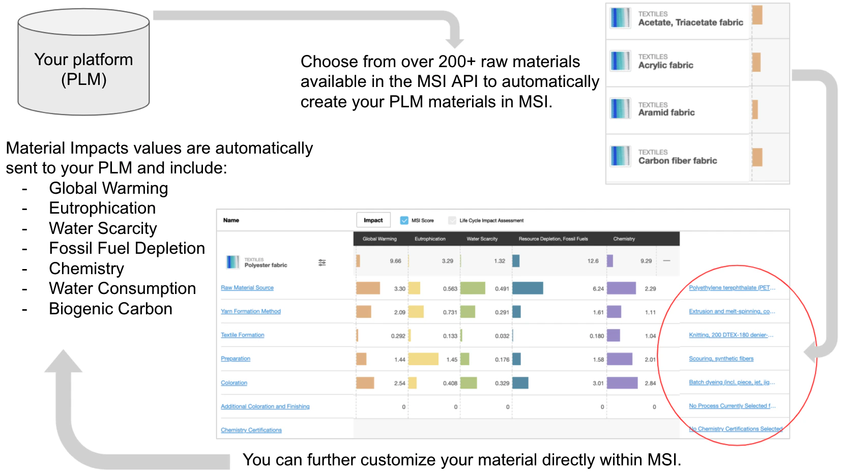 The Higg Materials Sustainability Index (MSI) is a material scoring tool that measures the environmental impacts of material production from raw material to the finished processing of the material. The Higg MSI API can be used by companies to integrate Higg MSI data within their own internal systems. It can also be used by third-parties, such as Product Lifecycle Management (PLM) systems, to enable shared customers to access Higg MSI account data in the third-party system. Integrating Higg MSI impacts into internal and third-party systems allows designers and sustainability stakeholders to compare material impacts as they make material choices and analyze impacts in their material portfolio. The MSI API consists of three primary endpoints:- Search : You can use the MSI Search endpoint to access Higg MSI API endpoints for all MSI module data that your account owns or that has been shared with your account. The Search API includes the Higg MSI normalized scores and Life Cycle Impact Assessment (LCIA) absolute values for the full material (but not for sub-process stages of material formation).